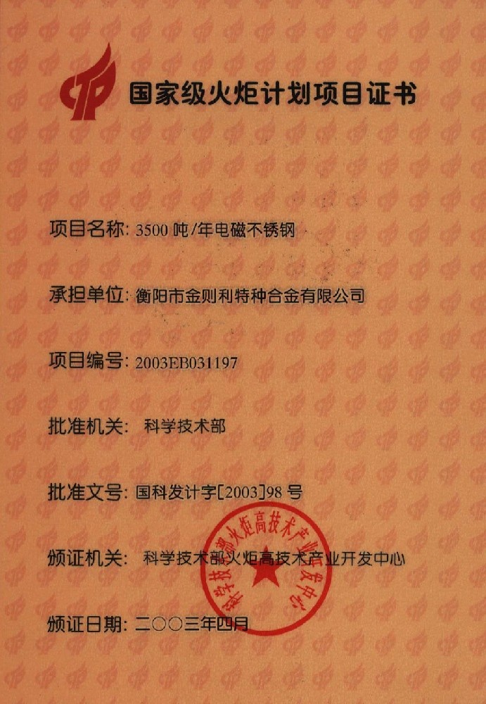 国家级火炬计划项目证书 |